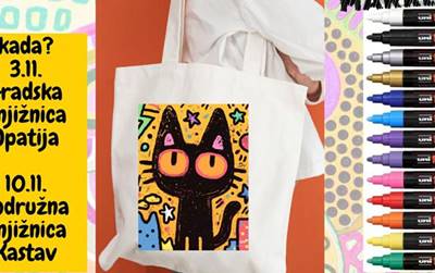 Radionica oslikavanja torbe za knjigu Radionica je namijenjena starijem školskom uzrastu, članovima knjižnice i onima koji će to tek postati! Prijave na: 📧gradska.knjiznica.opatija@gk- opatija.hr / knjiznica.kastav@gk-opatija.hr ☎️ 051/712-987 / 051/691-049 👋 osobno u knjižnicama Opatija i Kastav